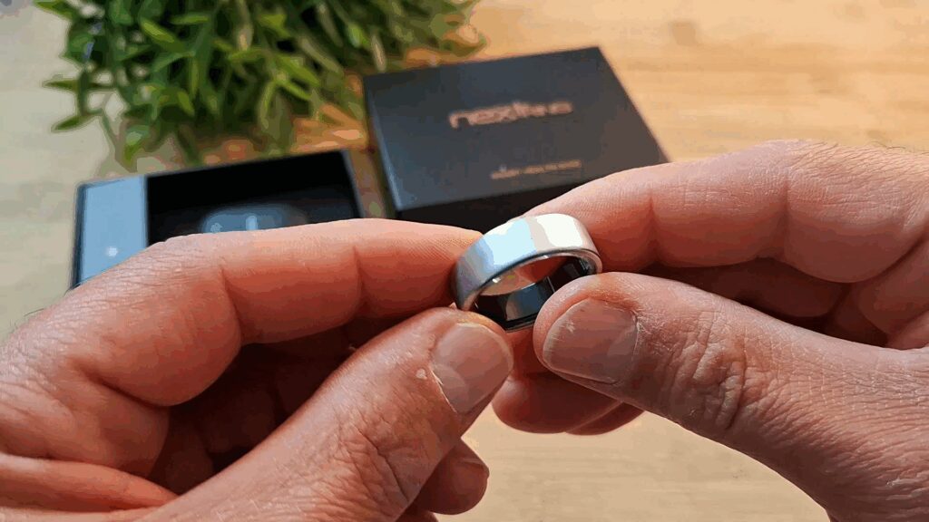 Der Ring ist komplett aus Titan gefertigt, was ihn robust und widerstandsfähig macht. Sowohl die Ringoberfläche als auch die Ringinnenseite sind glatt, mit Ausnahme der innenliegenden Sensoren, die sich minimal über die Oberfläche erheben – beim Tragen spürt man diese jedoch nicht.
