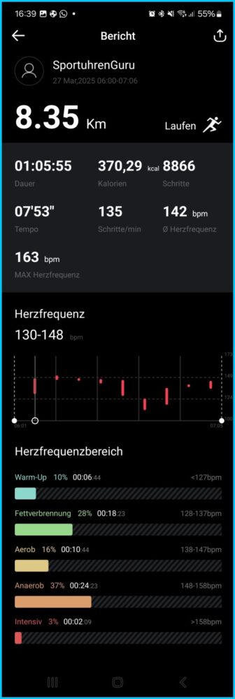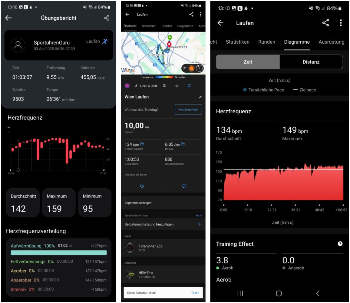 Die Trainingsaufzeichnungen beschränken sich auf das Wesentliche: Trainingsdauer, Distanz, durchschnittliche Pace, ein grob gehaltenes Herzfrequenzdiagramm und die wichtigsten Pulsdaten. Die Anzeige der Pulszonen schien zudem nicht korrekt zu sein.