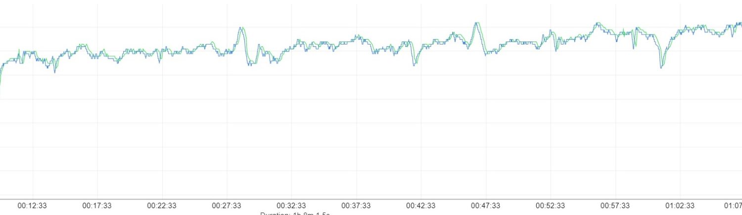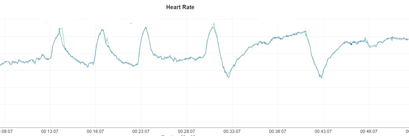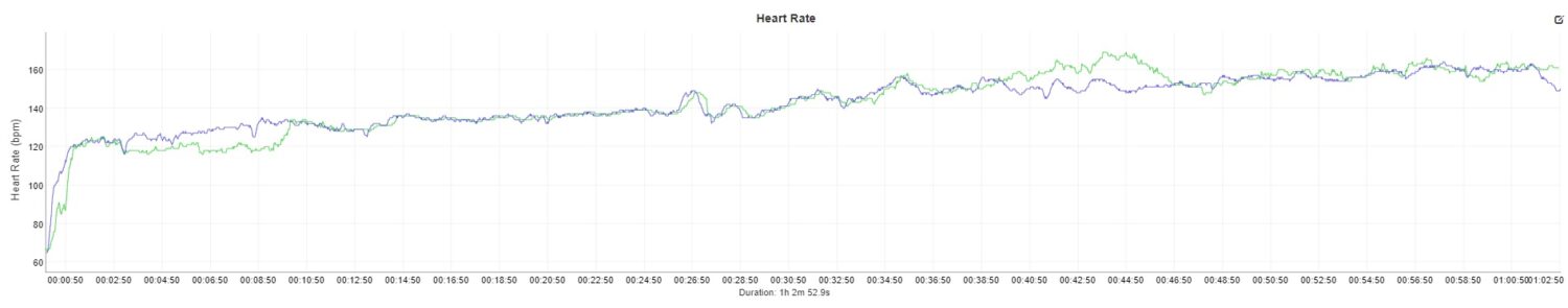 Schaut man sich aber den grafischen Vergleich der beiden Herzfrequenzen an, dann ist klar zu erkennen, daß die Amazfit Smartwatch gleich zu Beginn und im letzten Drittel große Probleme hat und deutliche Messunterschiede vorliegen.