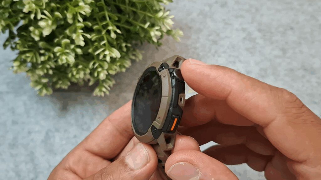 Das Uhrengehäuse misst 47,8 mm im Durchmesser und ist 14,8 mm dick. Mit dem Silikonarmband bringt die Uhr 61 Gramm auf die Waage. Das Gehäuse besteht aus faserverstärktem Kunststoff, während die Lünette mit einer Aluminiumlegierung aufgewertet wurde. Das Display wird durch gehärtetes Mineralglas geschützt.