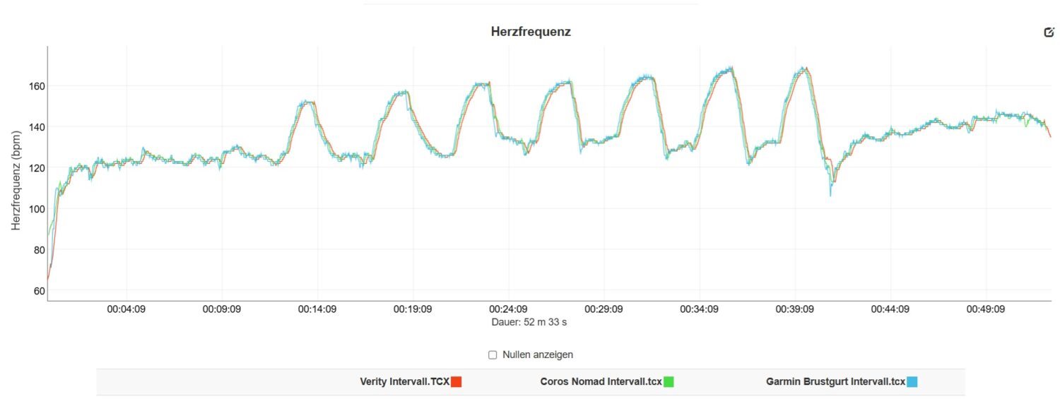 Auch beim Intervalltraining mit sieben Intervallen gibt es keinerlei Abweichungen oder Fehlmessungen. Alle drei Geräte zeichneten praktisch dieselben Messdaten auf: