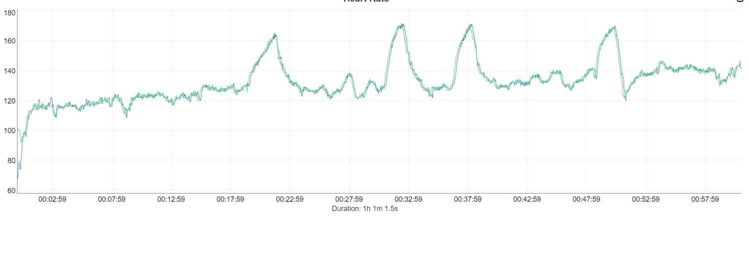 Wie Du sehen kannst, habe ich insgesamt vier Mal das Tempo deutlich gesteigert. Dazwischen gab es ein paar kürzere Phase in denen ich ebenfalls schneller lief. Die Coros Pace 3 hatte hinsichtlich der Pulsmessung mit dem permanenten Tempowechsel absolut kein Problem und lieferte fast idente Messdaten im Vergleich zum Brustgurt.