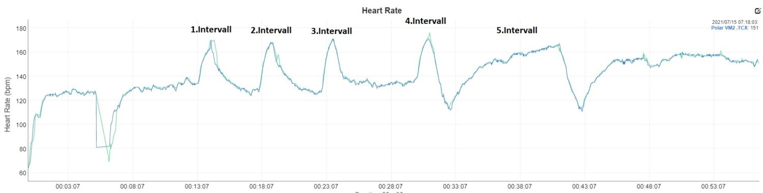 Das Diagramm zeigt deutlich, daß die Messungen beider Geräte fast ident sind. Nur bei den Intervallen gibt es ein paar wirklich nur minimale Abweichungen seitens der Venu 2.