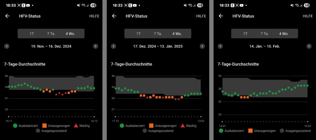 In diesen 18 Monaten gab es natürlich auch einige Phasen, in denen meine Herzfrequenzvariabilität sank und sich für einige Tage auf niedrigen Niveau bewegte. Jedesmal gab es dafür auch ein guten Grund.