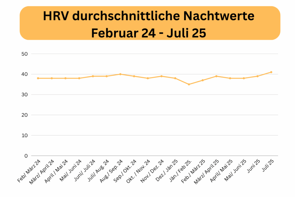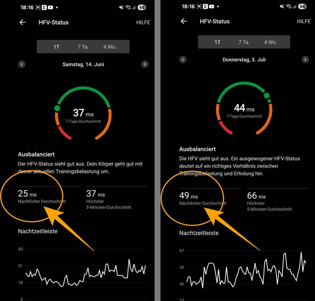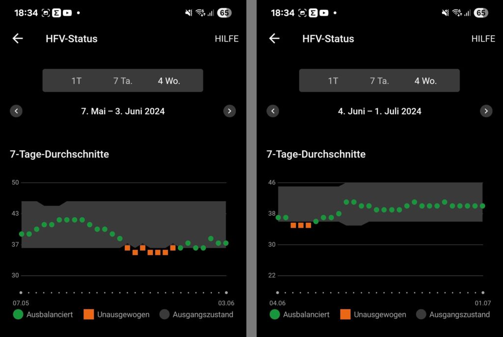 Auch wenn meine Herzfrequenzvariabilität einen insgesamt sehr stabilen Verlauf zeigt, gibt es natürlich auch Schwankungen. So wurden beispielsweise im Juni und Juli diesen Jahres die bisher niedrigsten und höchsten Messwerte aufgezeichnet, wie nachstehende Bilder zeigen.