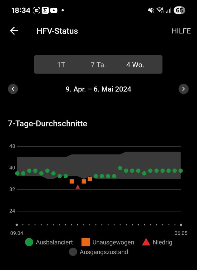 Anfang April war ich in bester Verfassung, meine Messdaten bewegten sich immer um die 40 ms herum. Doch plötzlich sank die Herzfrequenzvariabilität deutlich ab und laut HRV Status befand ich mich sogar in einem unausgewogenen Zustand.