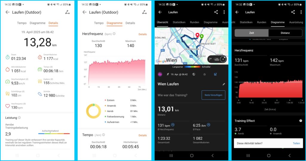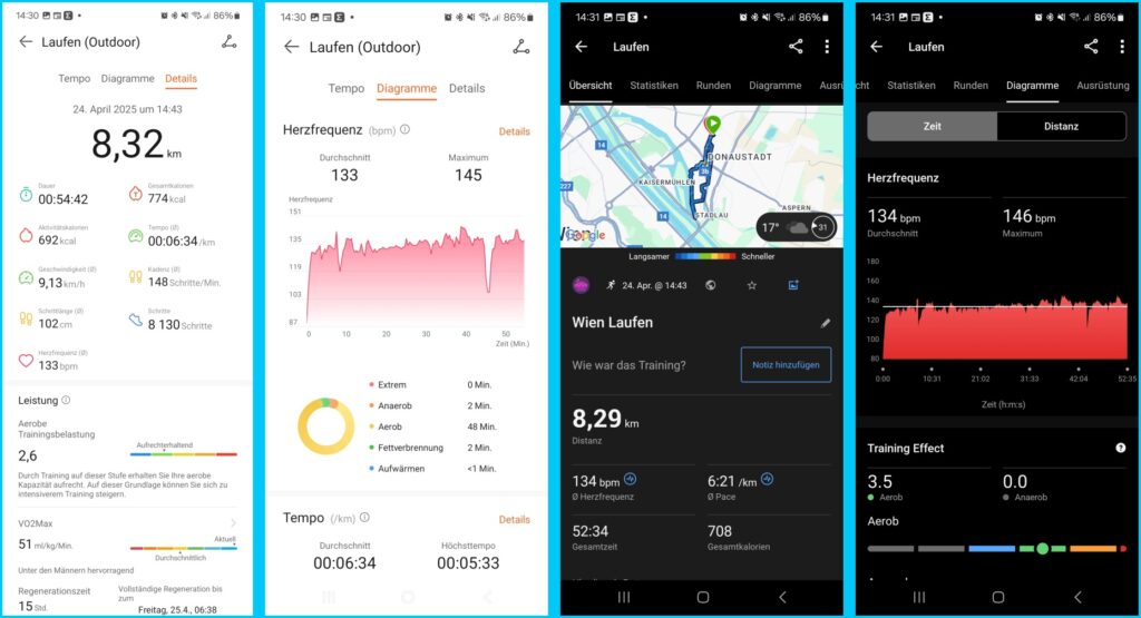 In meinen Tests hat mich die Genauigkeit dieser Methode überrascht: Bei einem Lauf von etwa 8,3 km (gemessen mit der Garmin Forerunner 255 mit Dualband GNSS) zeigte das Huawei Band 10 mittels Schrittzähler eine Strecke von 8,32 km an – ein beeindruckendes Ergebnis! Ähnliches gilt für die Herzfrequenzmessung, die praktisch deckungsgleich mit dem Garmin Brustgurt war.