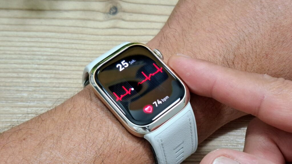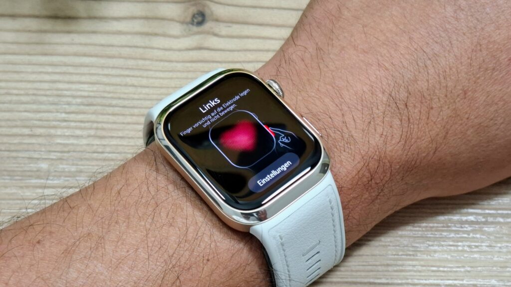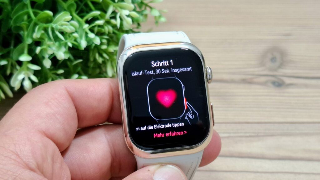 Um eine EKG Messung durchzuführen, startest Du die entsprechende App direkt an der Uhr. Gleich im nächsten Schritt wirst Du dazu aufgefordert, den Zeigefinger auf die untere Taste aufzulegen. Damit wird ein Stromkreis geschlossen, der die Aufzeichnung der elektrischen Herzaktivitäten ermöglicht.