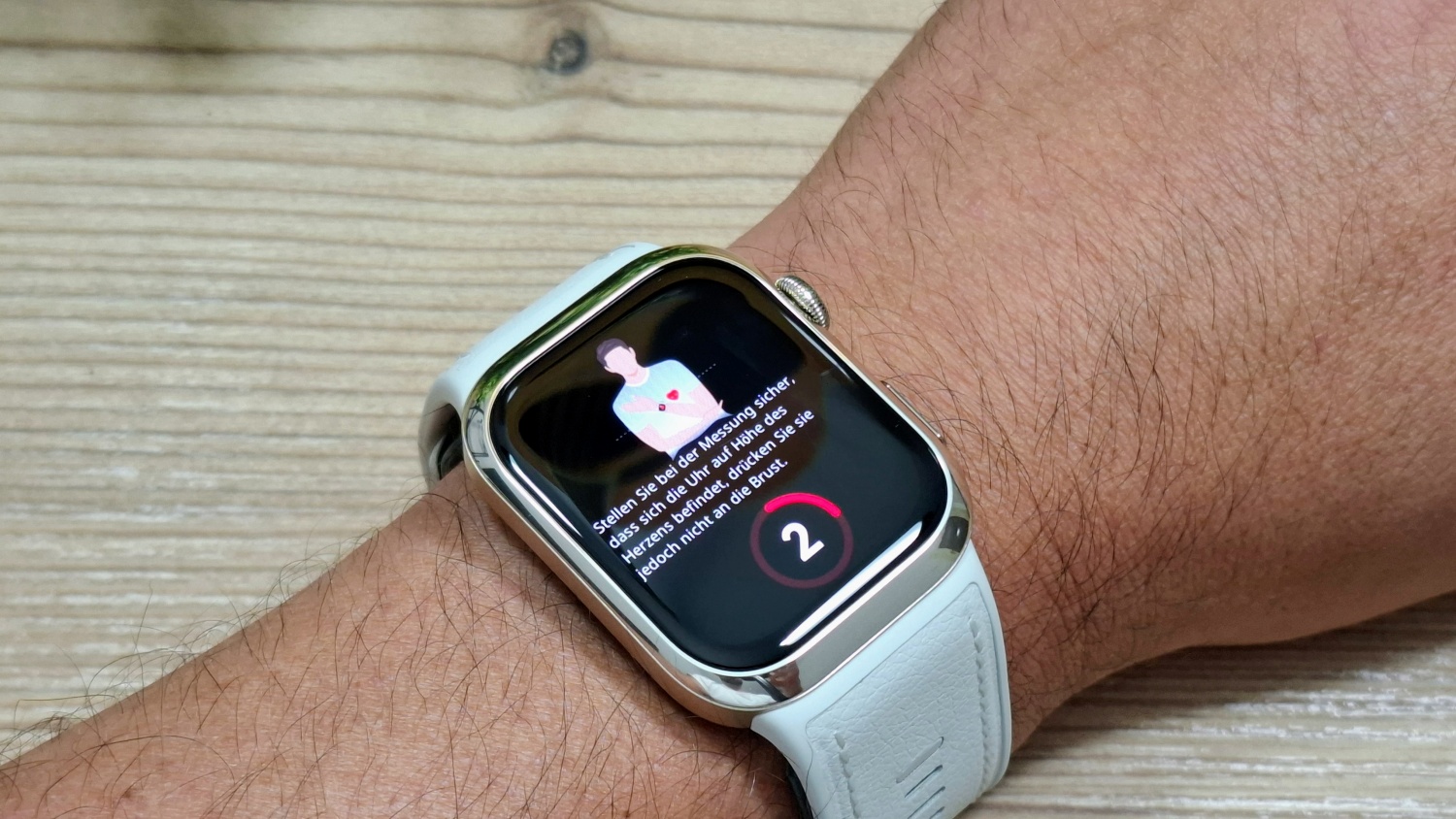 Um eine EKG Messung durchzuführen, startest Du die entsprechende App direkt an der Uhr. Gleich im nächsten Schritt wirst Du dazu aufgefordert, den Zeigefinger auf die untere Taste aufzulegen. Damit wird ein Stromkreis geschlossen, der die Aufzeichnung der elektrischen Herzaktivitäten ermöglicht.
