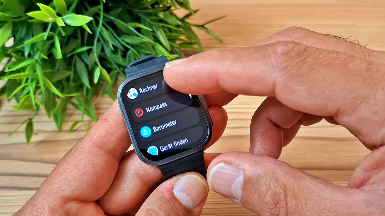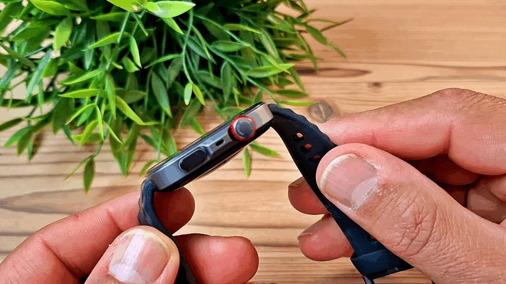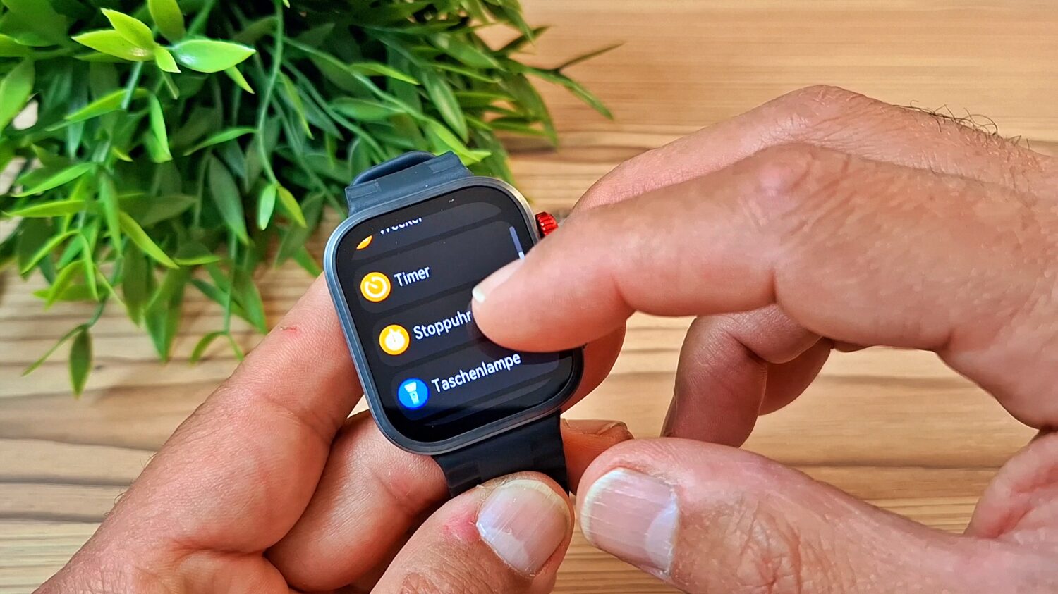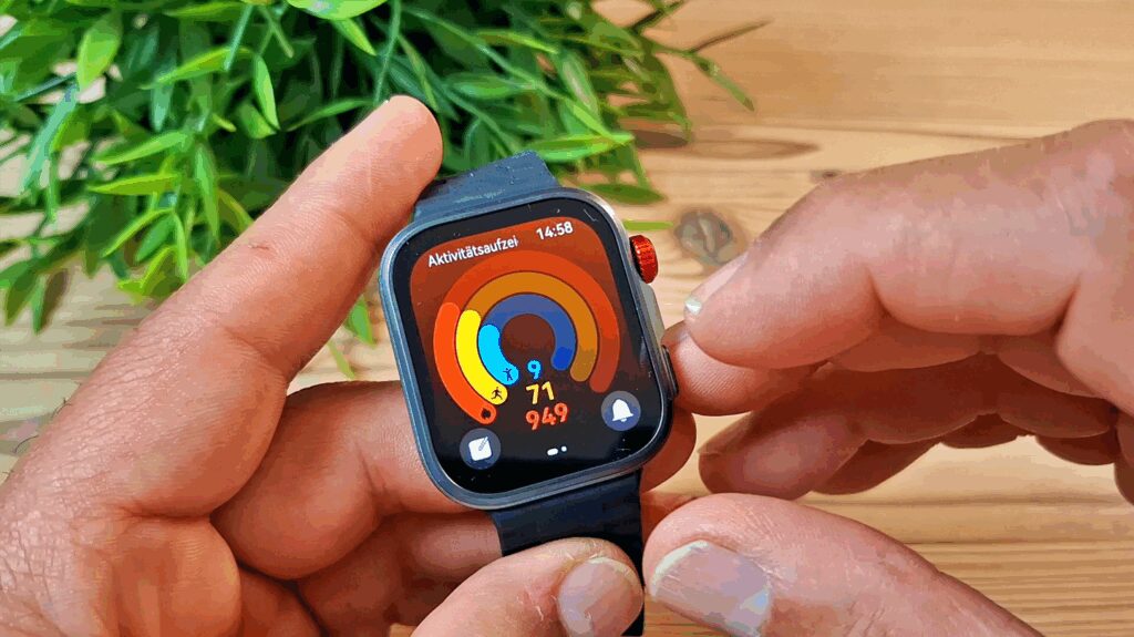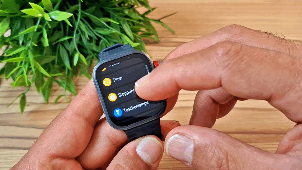 Zusätzlich verfügt die Uhr über eine drehbare Krone, mit der Du durch verschiedene Menüs scrollen kannst. Diese Funktion ist allerdings etwas eingeschränkt, da es beispielsweise nicht möglich ist, durch Drücken der Krone eine Funktion auszuwählen.