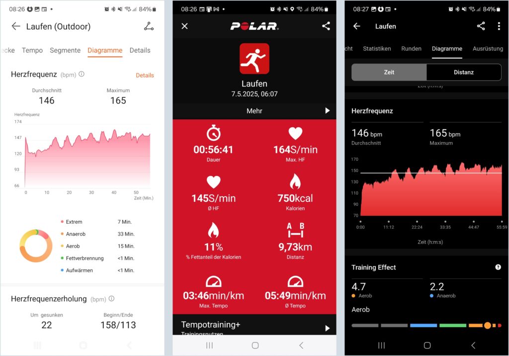 - Huawei Watch Fit 4: Ø 146 bpm, Max. 165 bpm