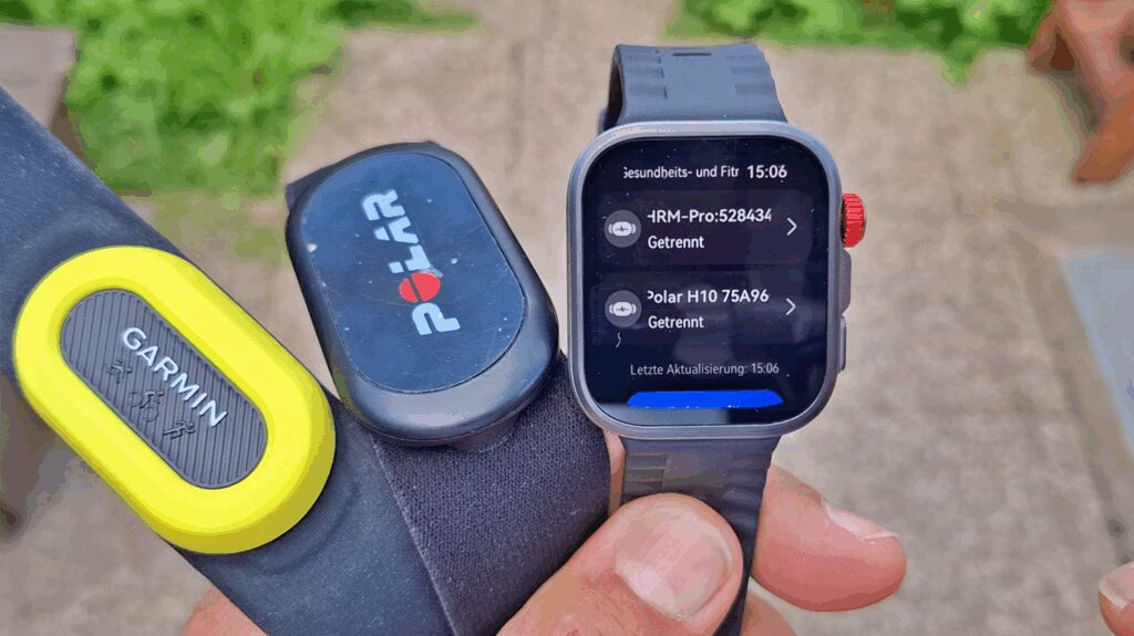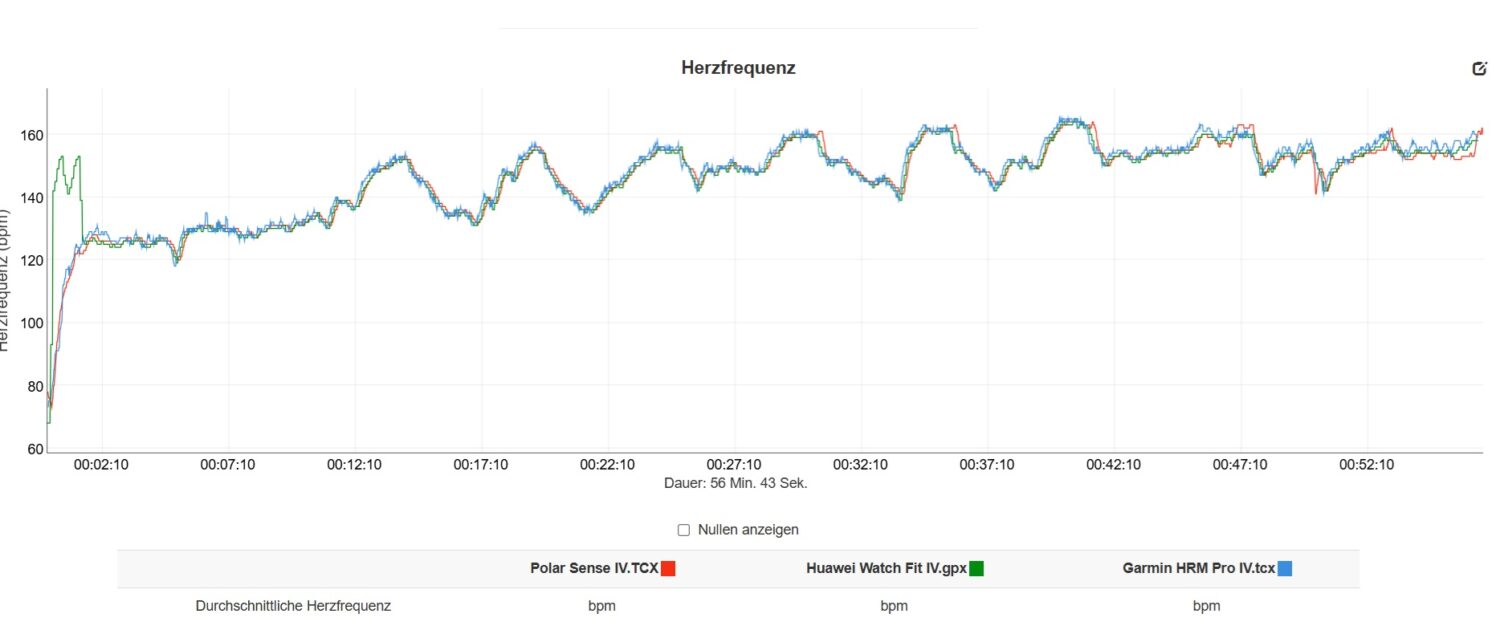 Im Test mit externen Referenzsensoren (Garmin HRM Pro Brustgurt und Polar Verity Sense optischer Sensor) lieferte die Watch Fit 4 beeindruckend präzise Ergebnisse. Nach einer kurzen Eingewöhnungsphase konnte die Uhr auch bei einem fordernden Intervalltraining sehr gut mit den externen Sensoren mithalten.