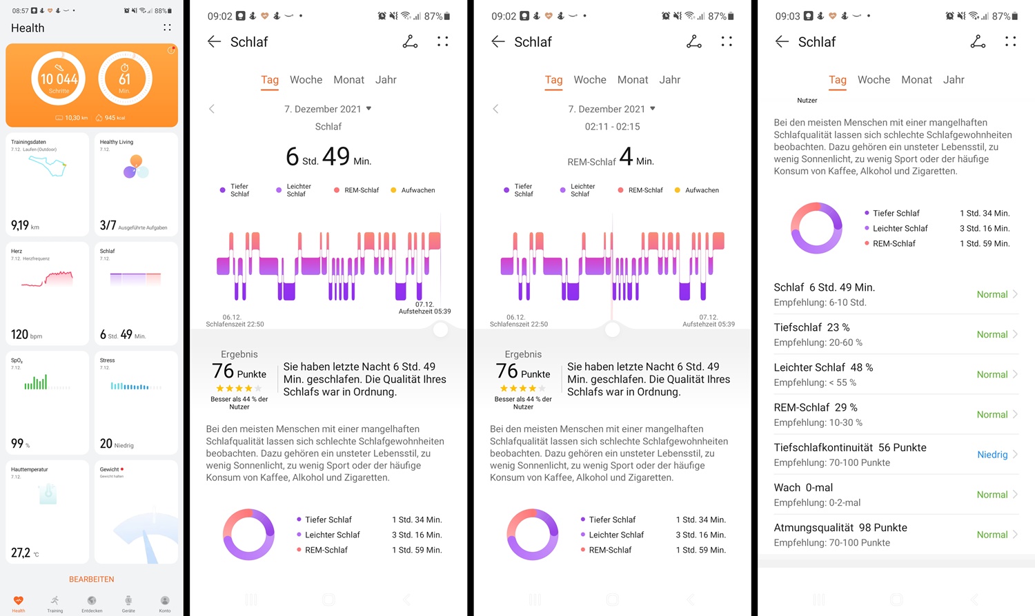 Neben den üblichen Grundfunktionen wie Schrittzählung, Distanz, Kalorienverbrauch und einer detaillierten Schlafaufzeichnung finden sich noch weitere Features, die wir von den Vorgängermodellen bereits kennen. Wie die SpO2-Messung, Hauttemperatur, Stress oder Atemübungen.