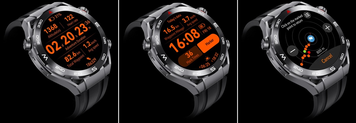 Was den Expeditionsmodus betrifft, hat sich Huawei auch ein paar nette Gadgets einfallen lassen. Zur präzisen Standortermittlung und Streckenmessung ist die Watch Ultimate mit einem Dual Band Fünf System GNSS ausgestattet. Gleichzeitig liefert die Smartwatch Echtzeit-Umgebungsdaten wie Höhe, Barometer mit Sturmwarnungen, Sonnenauf- und -untergang, Mondphase und Gezeiten.