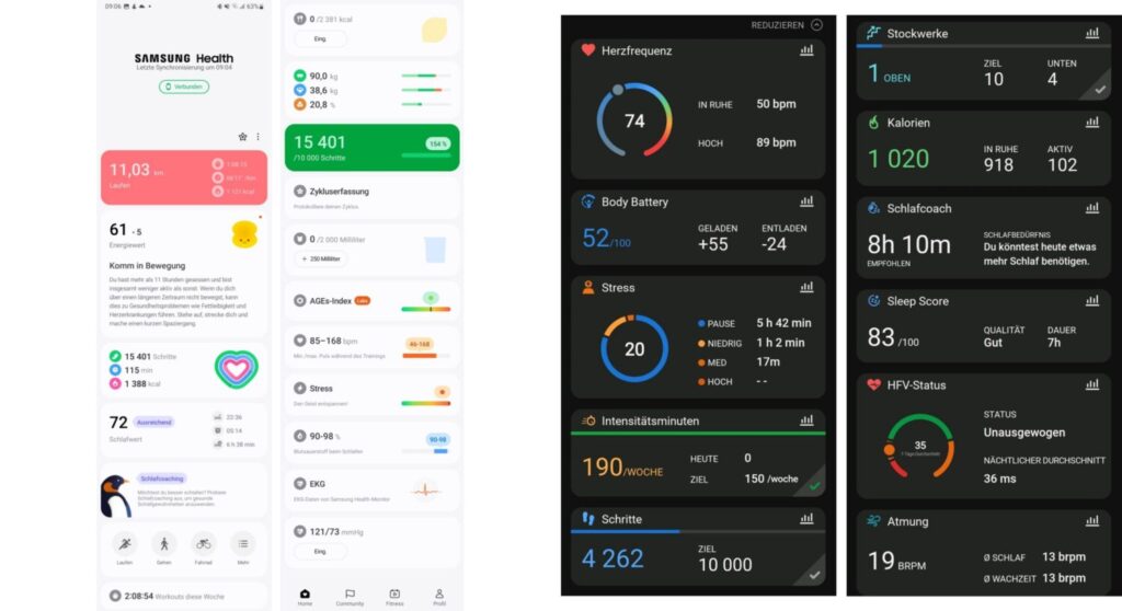 Beide Uhren kümmern sich auch um das wichtige Thema Herzfrequenvariabiltität. Garmin bietet dazu die beliebte Body Battery an und Samsung hat dafür den Energy Score (Energiewert) entwickelt. Im Wesentlichen sagen Dir beide Tools wie gut Du erholt bist und wie es um Deine Tagesverfassung bestellt ist.