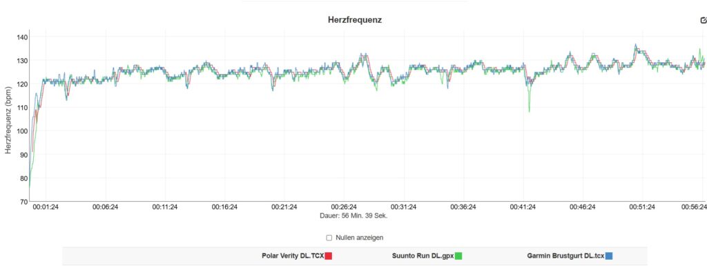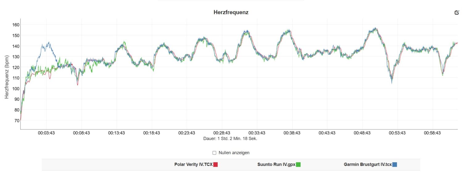 Interessanter wird es bei Tempowechseln: Bei einem Lauf mit variierendem Tempo gab es zu Beginn bei allen drei Geräten Probleme. Besonders auffällig war der Garmin-Brustgurt, der sich vorübergehend völlig aus dem Training verabschiedete. Die Suunto Run war hier interessanterweise noch am besten unterwegs.