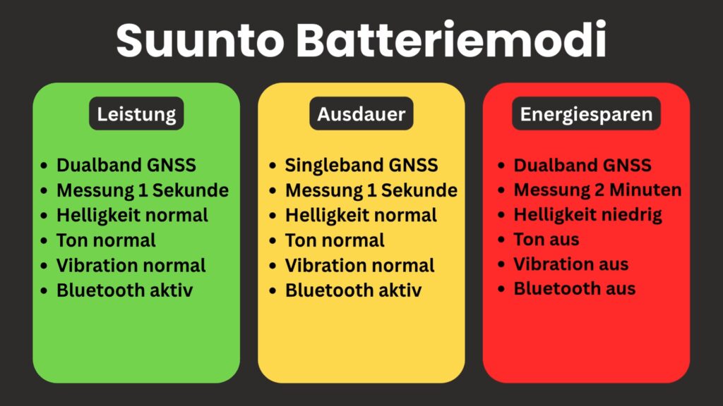 Für Einsteiger sind die Batteriemodi besonders interessant: Suunto stellt im Dualband-GNSS eine Akkulaufzeit von 20 Trainingsstunden in Aussicht. Wenn das für Deine geplanten Aktivitäten nicht reicht, hast Du über verschiedene Batteriemodi die Möglichkeit, die Akkulaufzeit noch einmal deutlich zu verlängern.
