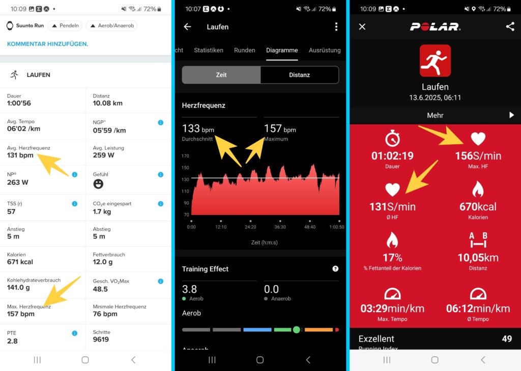 - Suunto Run: 131 Durchschnitt, 157 Maximum