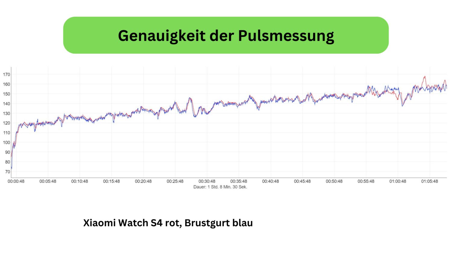 Auf den ersten Blick machen die Messung der Xiaomi Smartwatch durchaus einen soliden Eindruck. Doch sieht man etwas genauer hin, dann lassen sich zum Teil doch recht deutliche Abweichungen im Vergleich zu Brustgurt erkennen. Gegen Ende des Trainings hat die Watch S4 dann erhebliche Probleme korrekte Messdaten bereitzustellen.